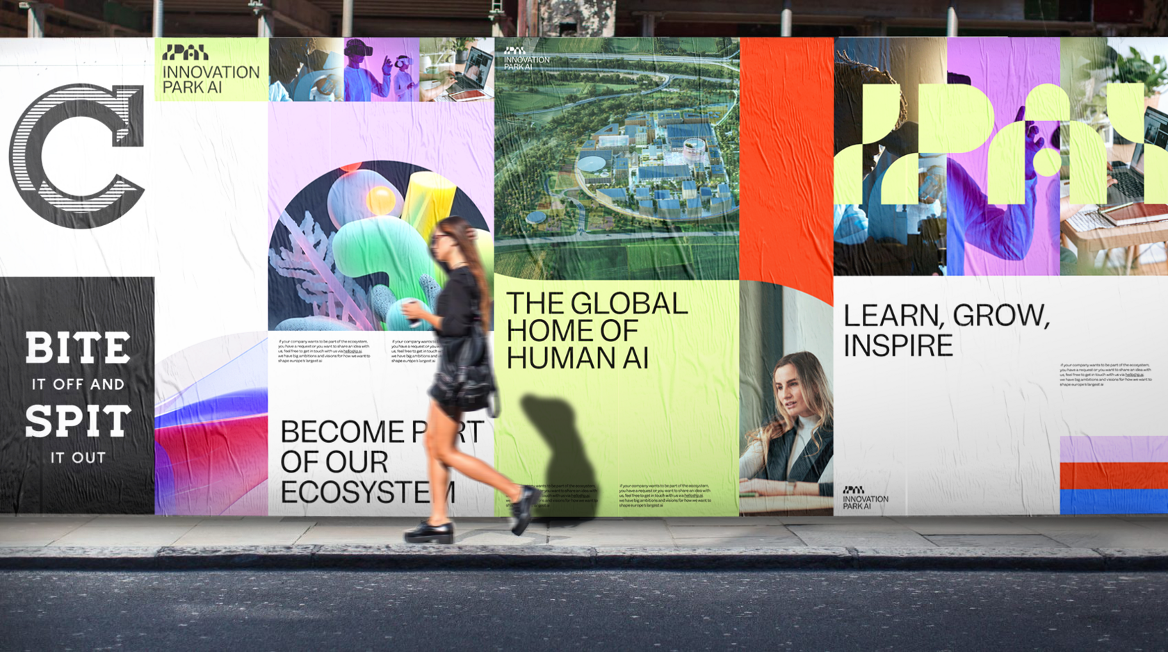 IPAI фокусируется на междисциплинарной коллаборации и приглашает на работу специалистов из очень разных областей, поэтому нашу разработка основана на логотипе-контейнере, состоящем из простых форм, чистых, ярких цветах и лаконичной типографике. Иллюстрациями послужили текстуры, сгенерированные и анимированные с помощью ИИ, они олицетворяют три столпа экосистемы IPAI: наука, экономика, исследования.