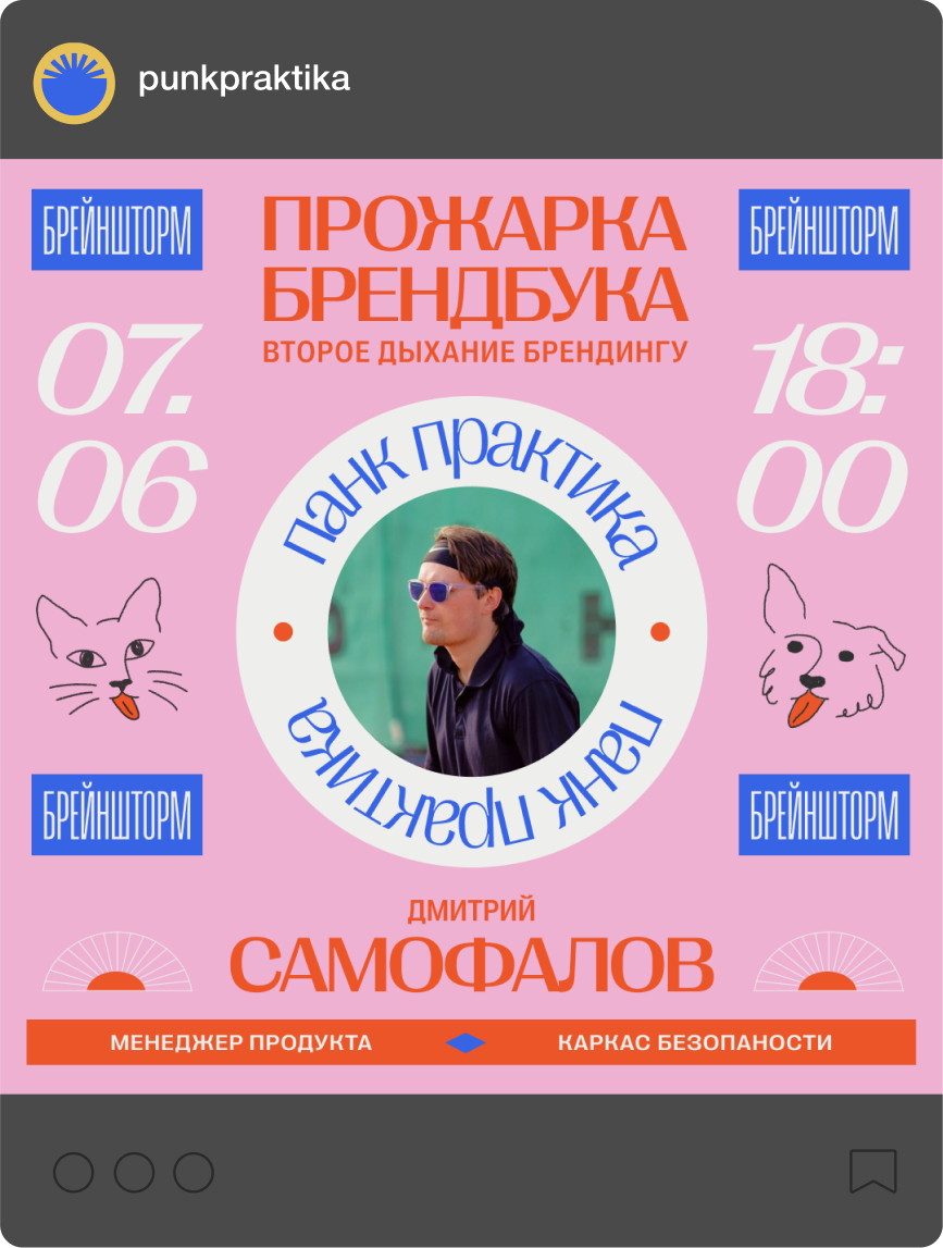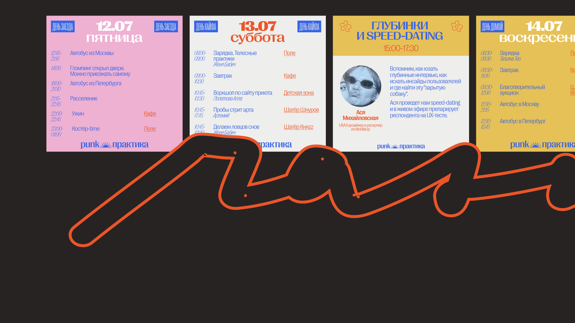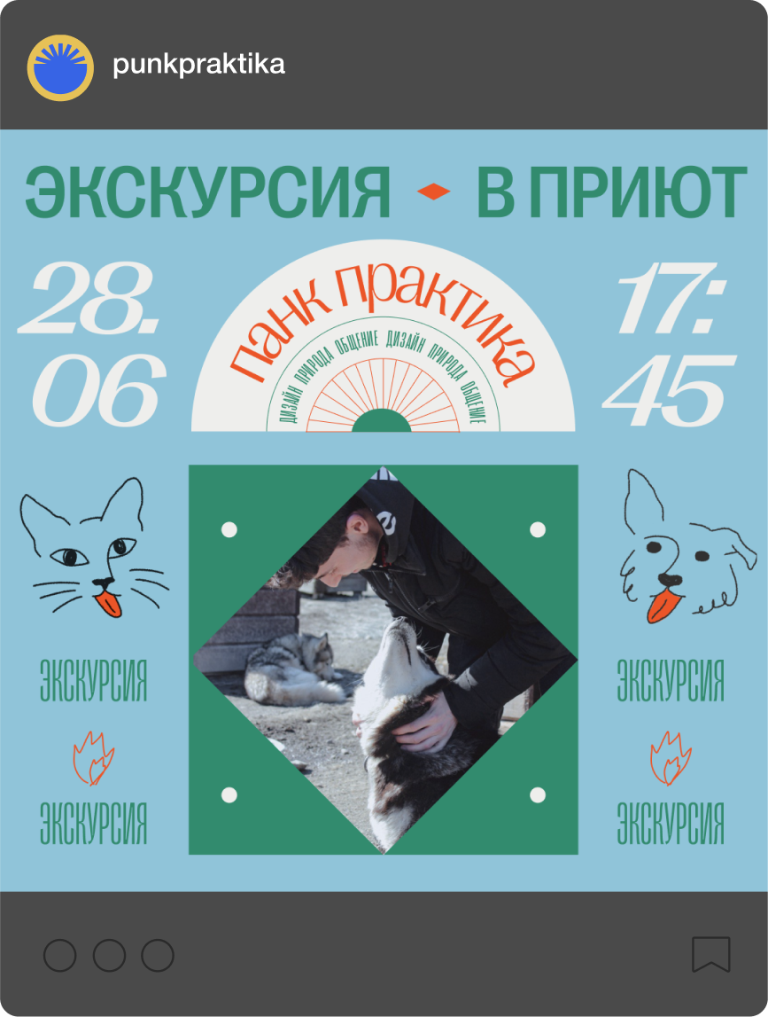 Проект для Панклаба — Панкпрактика — что-то вроде короткого летнего лагеря для дизайнеров и всех причастных, и оформление этого классного мероприятия было настоящим вызовом: мне не хотелось делать диджитальный минимализм в стиле других проектов студии, хотелось лета, солнца и чего-то живого. Так появилось решение, вдохновленное теплом фильмов Уэса Андерсона, скаутскими лагерями и наивными пастельными постерами с пинтереста. Практика была завязана на переработке сайта для приюта для животных, которому также перечислили бОльшую часть доходов с мероприятия. Поэтому мерч и частично остальной дизайн крутился вокруг портретов жильцов приюта.